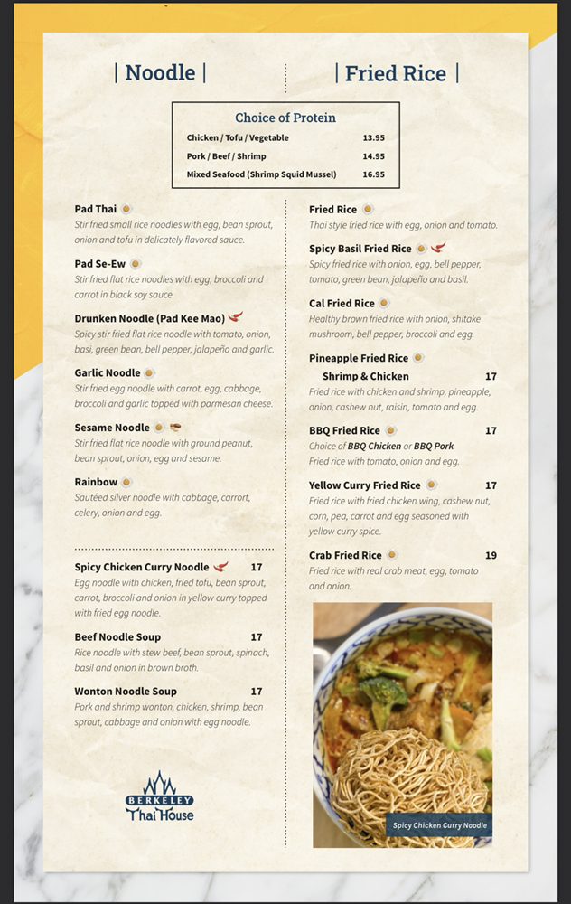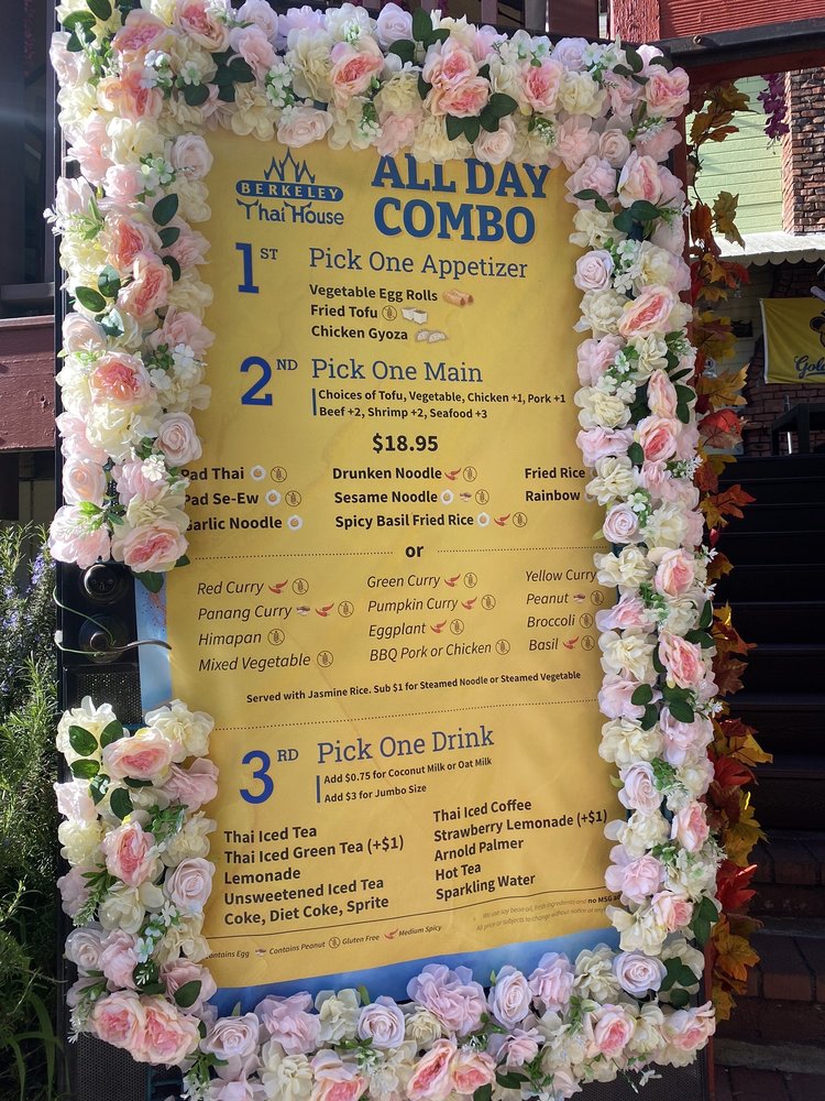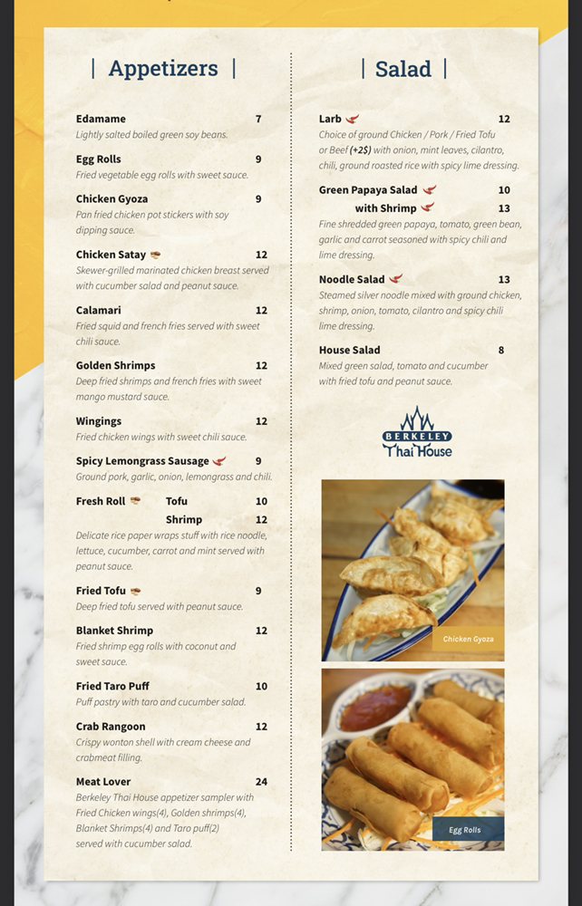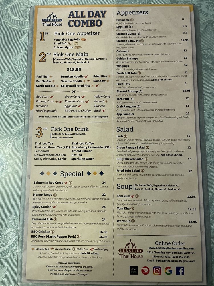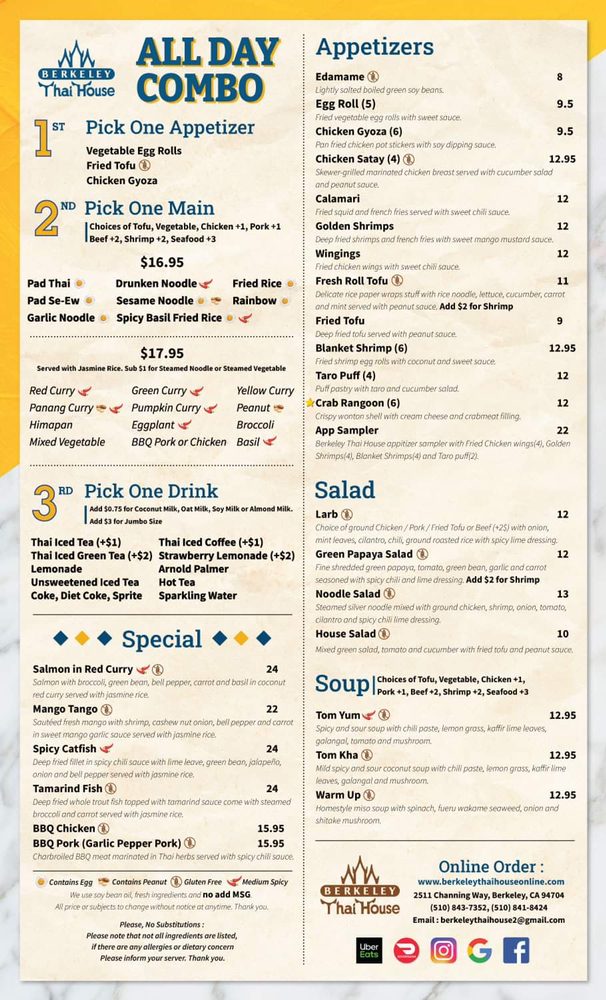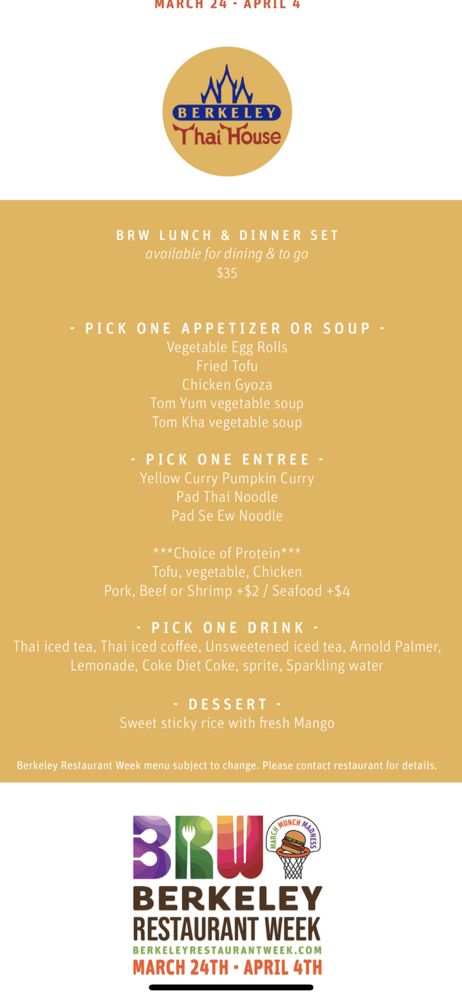 Berkeley Thai House, located in Berkeley, CA, offers a variety of Thai dishes with vegan and vegetarian options available. The restaurant provides takeout, delivery, and catering services, and has outdoor seating for a casual dining experience. Customers have praised the generous portions and affordable prices, making it a popular choice for students and groups. The menu features classic dishes like pad thai, drunken noodles, and spicy basil fried rice, all prepared with flavorful seasonings. The option to customize a combo meal with appetizers and a drink adds value to the dining experience. While some reviewers noted longer wait times for food, overall, Berkeley Thai House offers a satisfying meal with a range of options for different preferences.