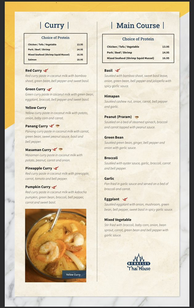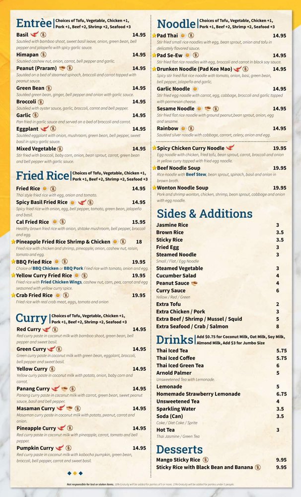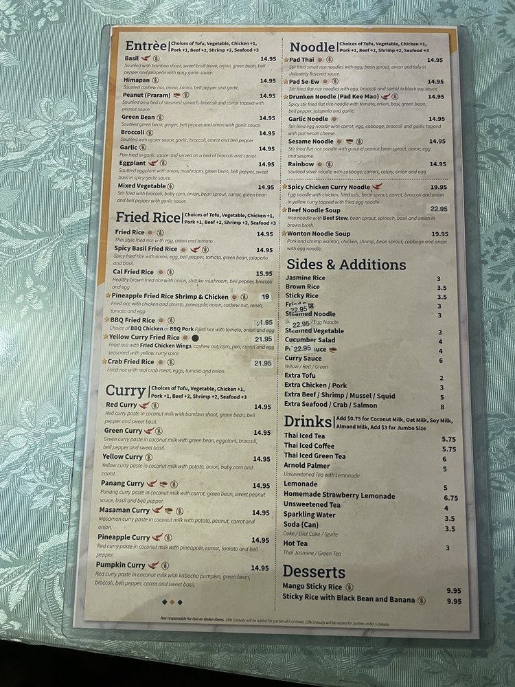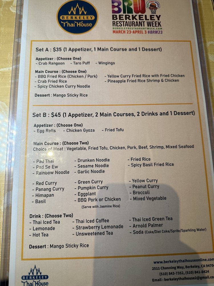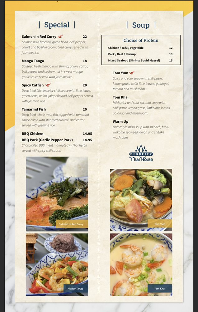 Berkeley Thai House, located in Berkeley, CA, offers a variety of Thai dishes with vegan and vegetarian options available. The restaurant provides takeout, delivery, and catering services, and has outdoor seating for a casual dining experience. Customers have praised the generous portions and affordable prices, making it a popular choice for students and groups. The menu features classic dishes like pad thai, drunken noodles, and spicy basil fried rice, all prepared with flavorful seasonings. The option to customize a combo meal with appetizers and a drink adds value to the dining experience. While some reviewers noted longer wait times for food, overall, Berkeley Thai House offers a satisfying meal with a range of options for different preferences.